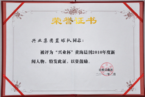 ·2011年2月,興業(yè)集團藍球隊被評為“興業(yè)杯”黃海晨刊2010年度新聞人物,特發(fā)此證,以資鼓勵