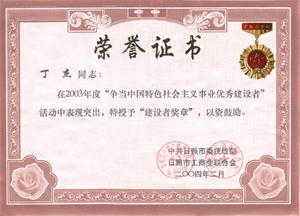· 2004年2月,授予丁杰董事長“爭當(dāng)中國特色社會主義事業(yè)優(yōu)秀建設(shè)者”