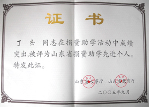 · 2005年9月,丁杰董事長榮獲“山東省捐資助學(xué)先進(jìn)個(gè)人”榮譽(yù)稱號