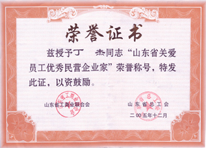 · 2005年12月,丁杰董事長榮獲“山東省關(guān)愛員工優(yōu)秀民營企業(yè)家”榮譽(yù)稱號