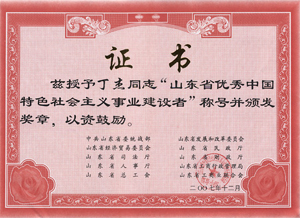 · 2007年12月,丁杰董事長榮獲“山東省優(yōu)秀中國特色社會主義事業(yè)建設(shè)者”榮譽(yù)稱號