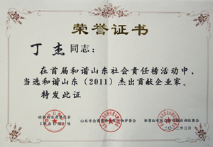 ·2012年3月,丁杰董事長當(dāng)選為“和諧山東杰出貢獻(xiàn)企業(yè)家”