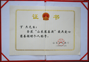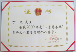 · 2009年5月,丁杰董事長榮獲“山東慈善獎(jiǎng)”最具愛心慈善捐贈(zèng)個(gè)人榮譽(yù)稱號