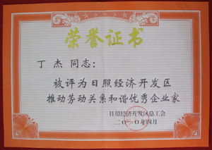 · 2010年4月,丁杰董事長榮獲“日照經(jīng)濟(jì)開發(fā)區(qū)推動(dòng)勞動(dòng)關(guān)系和諧優(yōu)秀企業(yè)家”榮譽(yù)稱號