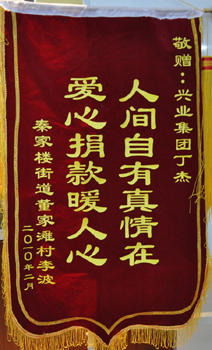 · 2010年2月,敬贈(zèng)興業(yè)集團(tuán)董事長丁杰“人間自有真情在,愛心捐款暖人心”錦旗