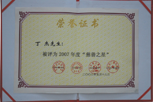 · 2008年5月,丁杰董事長榮獲“2007年度慈善之星”榮譽(yù)稱號