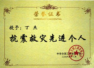 · 2008年12月,丁杰董事長榮獲“抗震救災(zāi)先進(jìn)個(gè)人”榮譽(yù)稱號