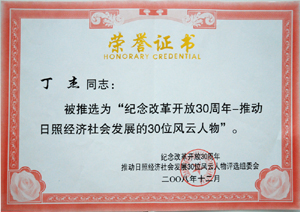 · 2008年12月,丁杰董事長被評為“紀(jì)念改革開放30周年風(fēng)云人物-推動(dòng)日照社會經(jīng)濟(jì)發(fā)展的30位風(fēng)云人物”