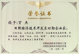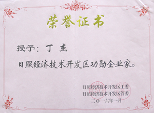 ·2015年2月,日照經(jīng)濟(jì)技術(shù)開發(fā)區(qū)授予丁杰董事長“日照經(jīng)濟(jì)技術(shù)開發(fā)區(qū)功勛企業(yè)家”稱號。