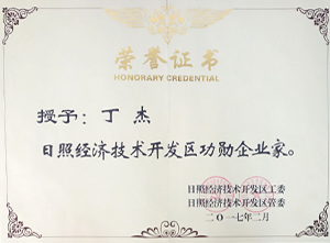 ·2017年2月,日照經(jīng)濟(jì)技術(shù)開發(fā)區(qū)授予丁杰董事長“日照經(jīng)濟(jì)技術(shù)開發(fā)區(qū)功勛企業(yè)家”稱號。